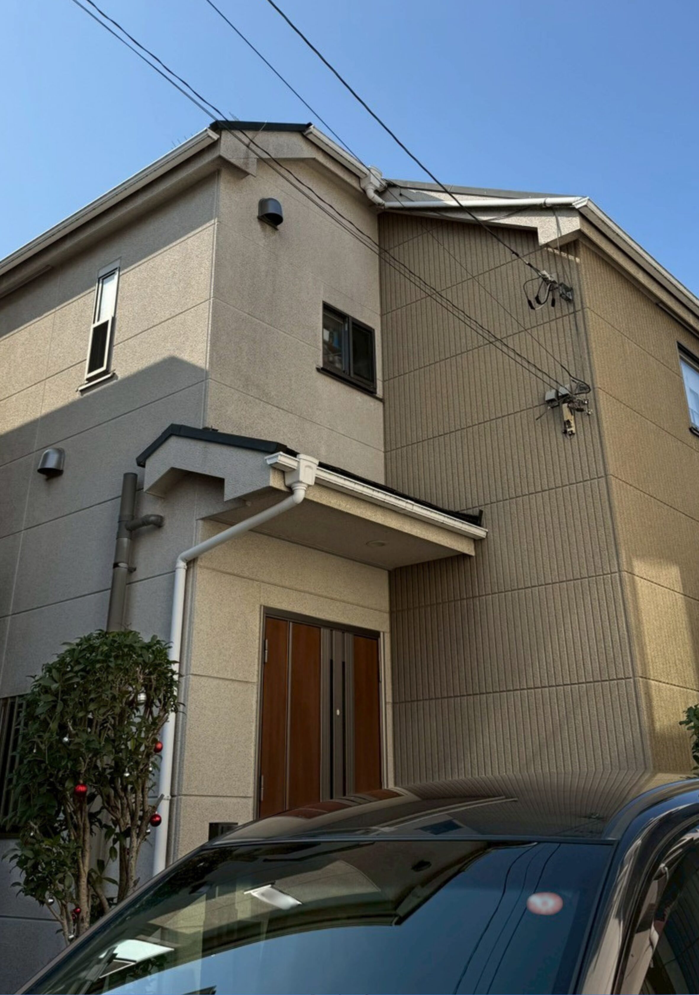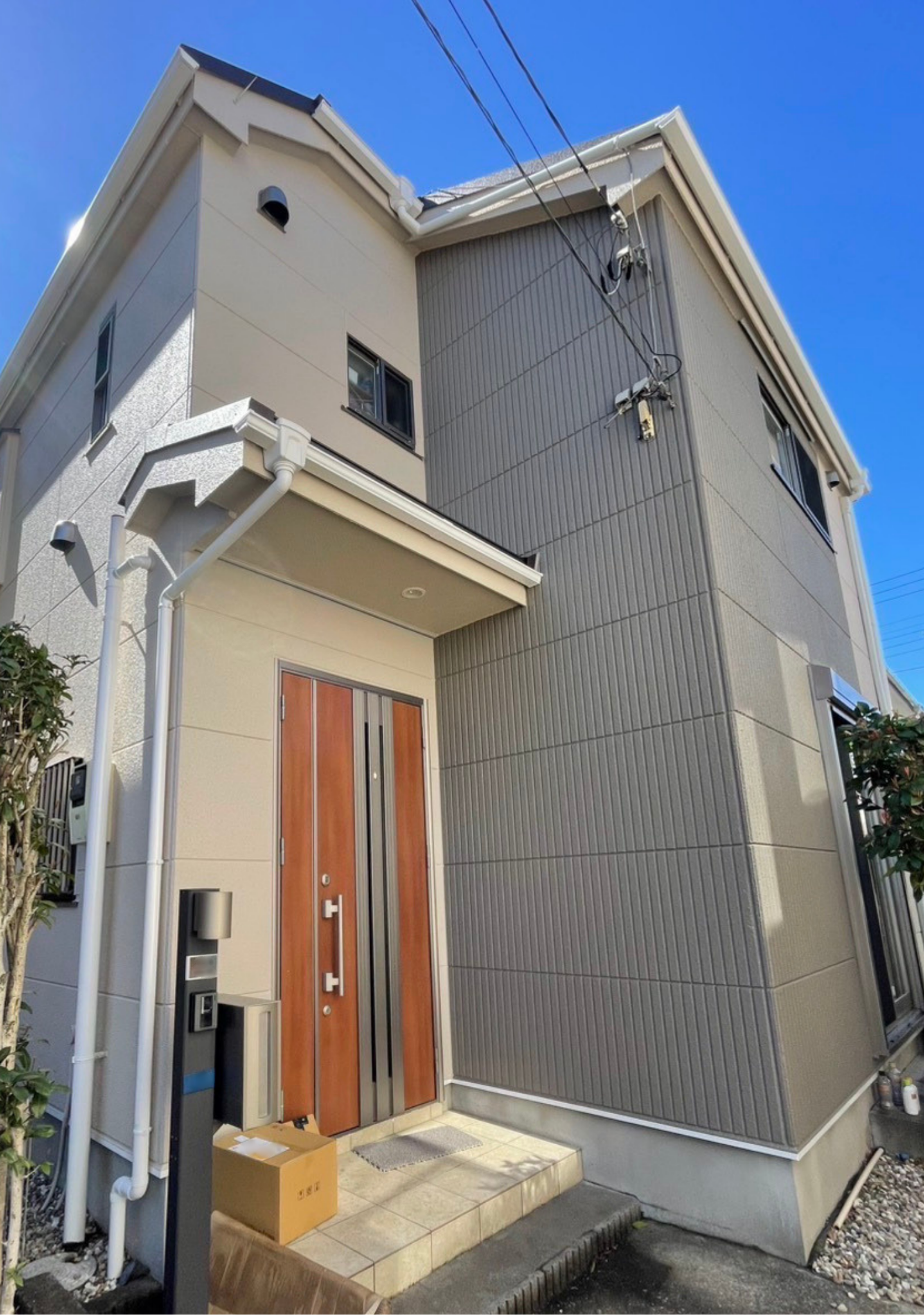 今回の施工では、明るい外壁に落ち着いたグレーのアクセントが映えることで、